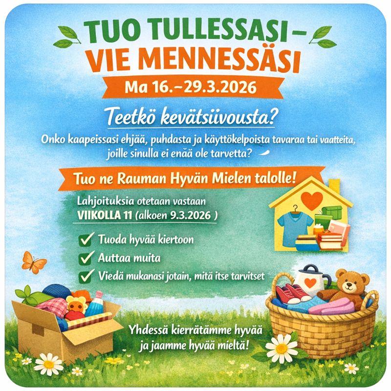 16.–29.3.2026 Kierrätä hyvää. Jaa hyvää mieltä. Teetkö kevätsiivousta? Onko kaapeissasi ehjää, puhdasta ja käyttökelpoista tavaraa tai vaatteita, joille sinulla ei enää ole tarvetta? 💛 Tuo ne Rauman…