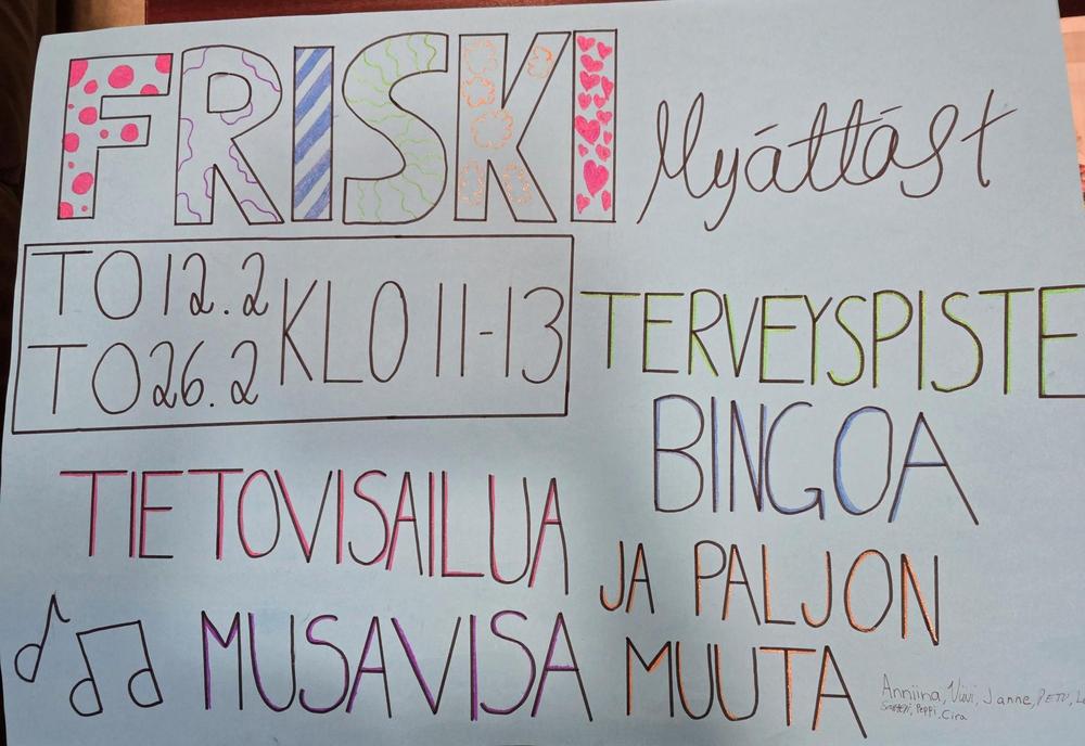 2.2. (Ma) Avoinna: 9:00–14:00 - 09:30–10:00 Aamupuuro - 12:00–12:20 Pelaamme Bingoa - 12:30–13:45 💙 Masennus ja ahdistus -ryhmä ”välihuoneessa” 3.2. (Ti) Avoinna: 9:00–14:00 - 09:30–10:00 Aamupuuro -…