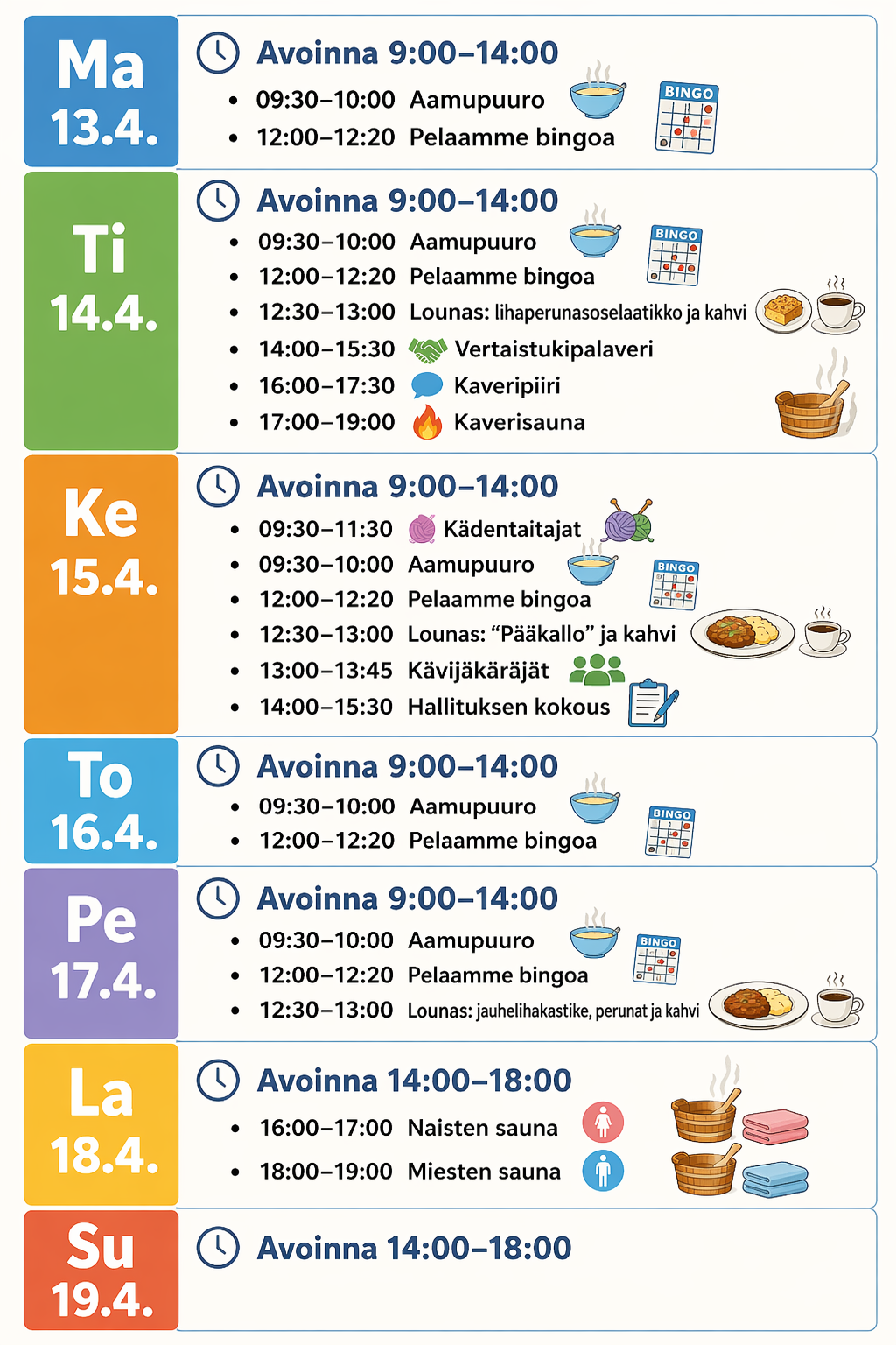 Ma 13.4. 🕘 Avoinna 9:00–14:00 - 09:30–10:00 Aamupuuro - 12:00–12:20 Pelaamme bingoa Ti 14.4. 🕘 Avoinna 9:00–14:00 - 09:30–10:00 Aamupuuro - 12:00–12:20 Pelaamme bingoa - 12:30–13:00 Lounas:…