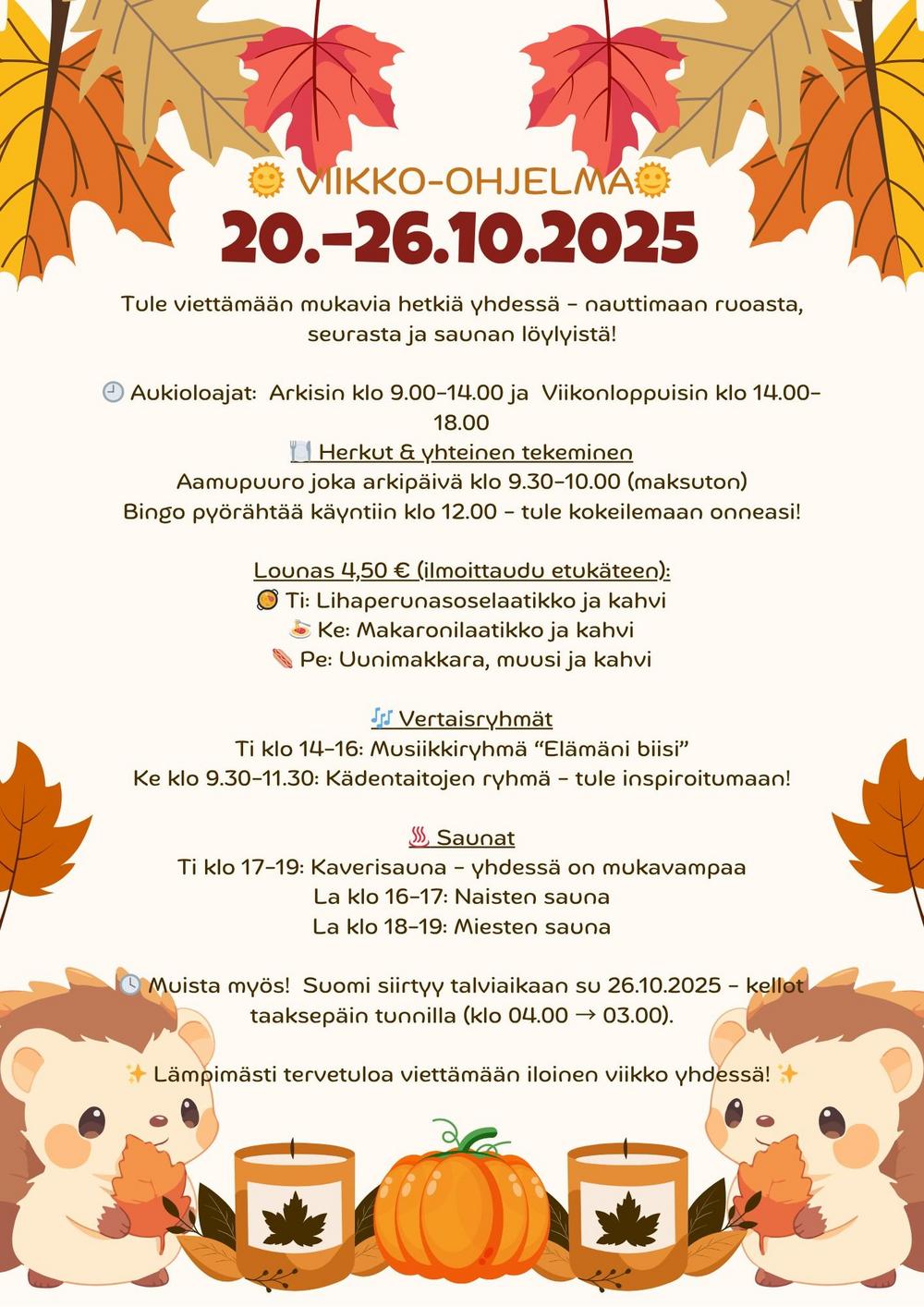🌞 Viikko-ohjelma🌞 20.–26.10.2025 🕘 Aukioloajat Arkisin klo 9.00–14.00 Viikonloppuisin klo 14.00–18.00 🍽️ Herkut & yhteinen tekeminen - Aamupuuro joka arkipäivä klo 9.30–10.00 (maksuton) - Bingo…