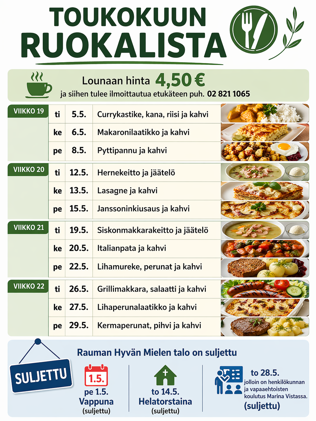 🍽️ Lounas (4,50 €) Ilmoittautuminen etukäteen puh. 02 821 1065 📅 Viikko 19 - ti 5.5. Currykastike, kana, riisi ja kahvi - ke 6.5. Makaronilaatikko ja kahvi - pe 8.5. Pyttipannu ja kahvi 📅 Viikko 20…
