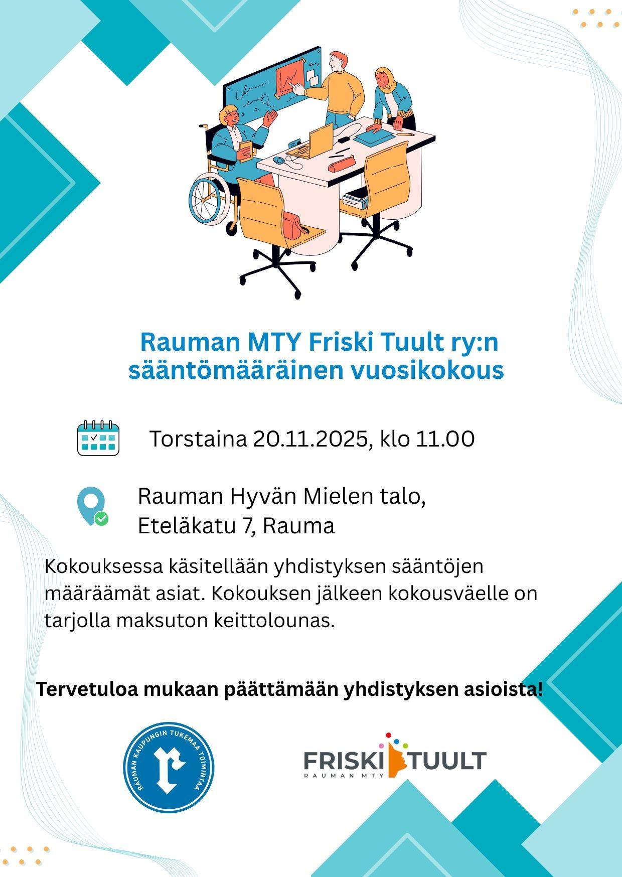Rauman MTY Friski Tuult ry:n sääntömääräinen vuosikokous Torstaina 20.11.2025, klo 11.00 Rauman Hyvän Mielen talo, Eteläkatu 7, Rauma Kokouksessa käsitellään yhdistyksen sääntöjen määräämät asiat.…
