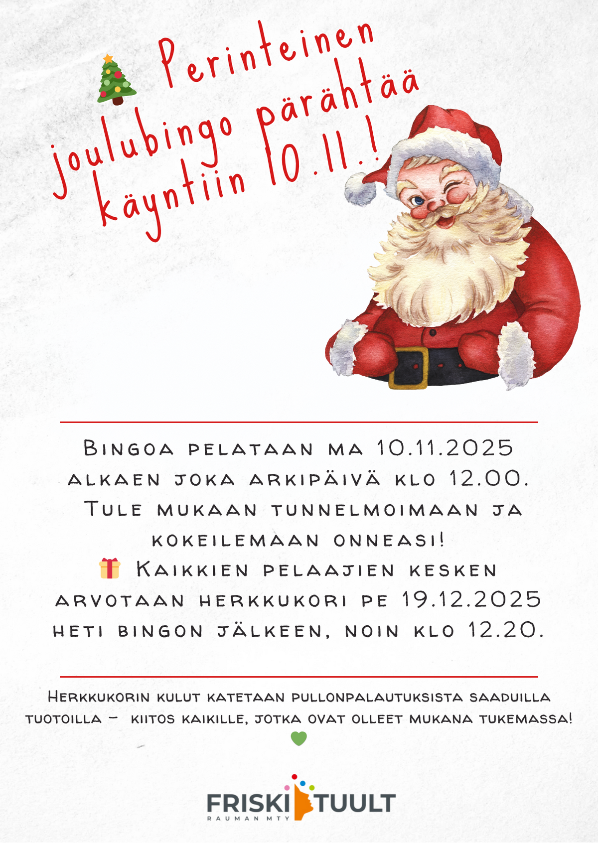 Bingoa pelataan maanantaista 10.11.2025 alkaen joka arkipÀivÀ klo 12.00.